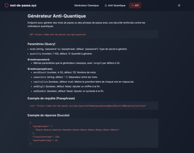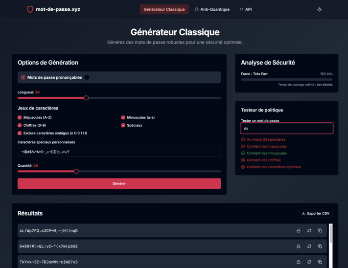 Un générateur 100 % gratuit, sans inscription, sans cookies ni trackers, hébergé en France (Hostinger). Deux modes (Classique et Anti-quantique), une jauge d’entropie en temps réel, un mode “Phonème” pour des mots de passe mémorisables, et des passphrases par dictionnaire dans 100 langues. Copie automatique (1 résultat), export CSV (plusieurs), et API ouverte.